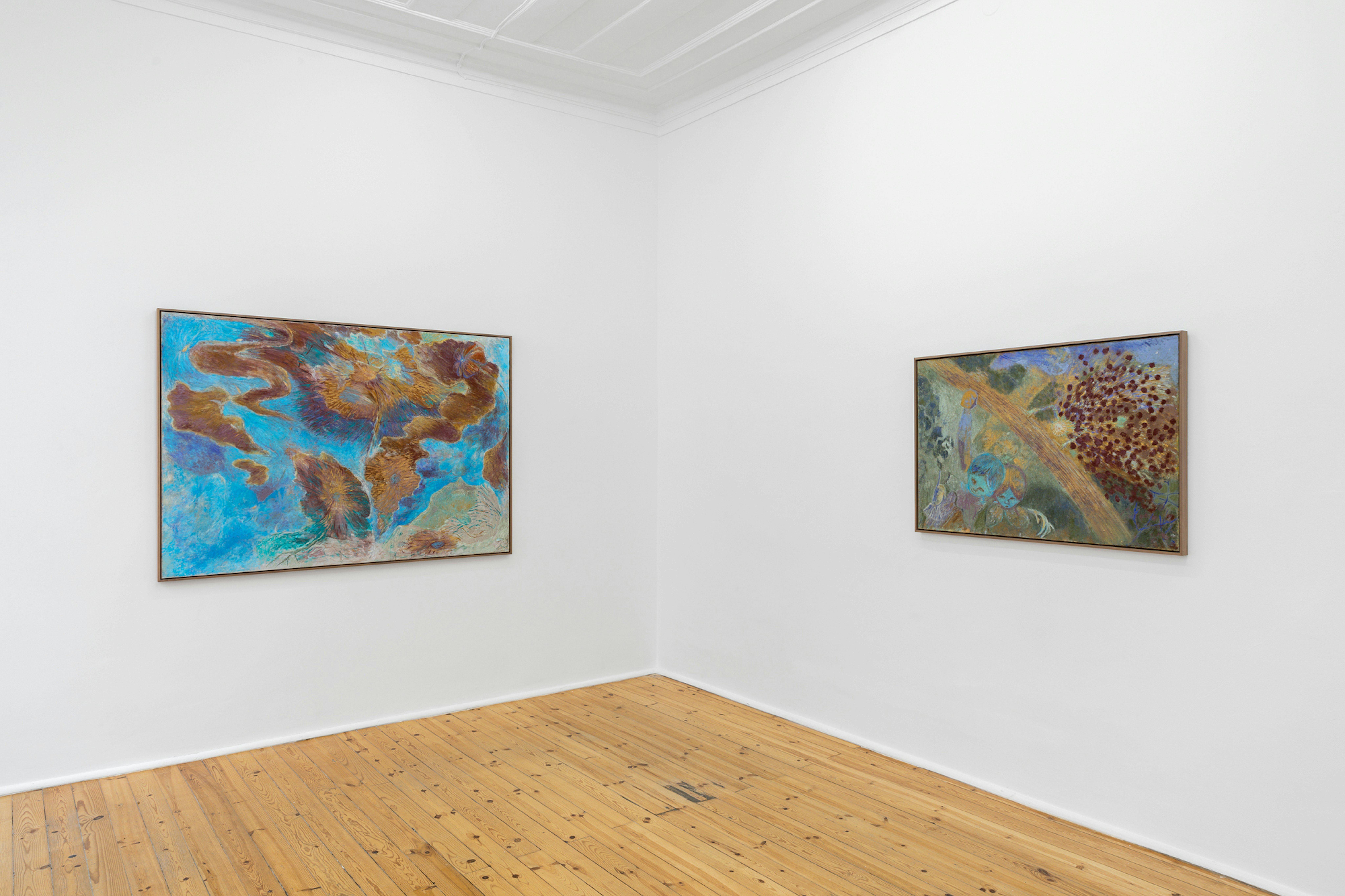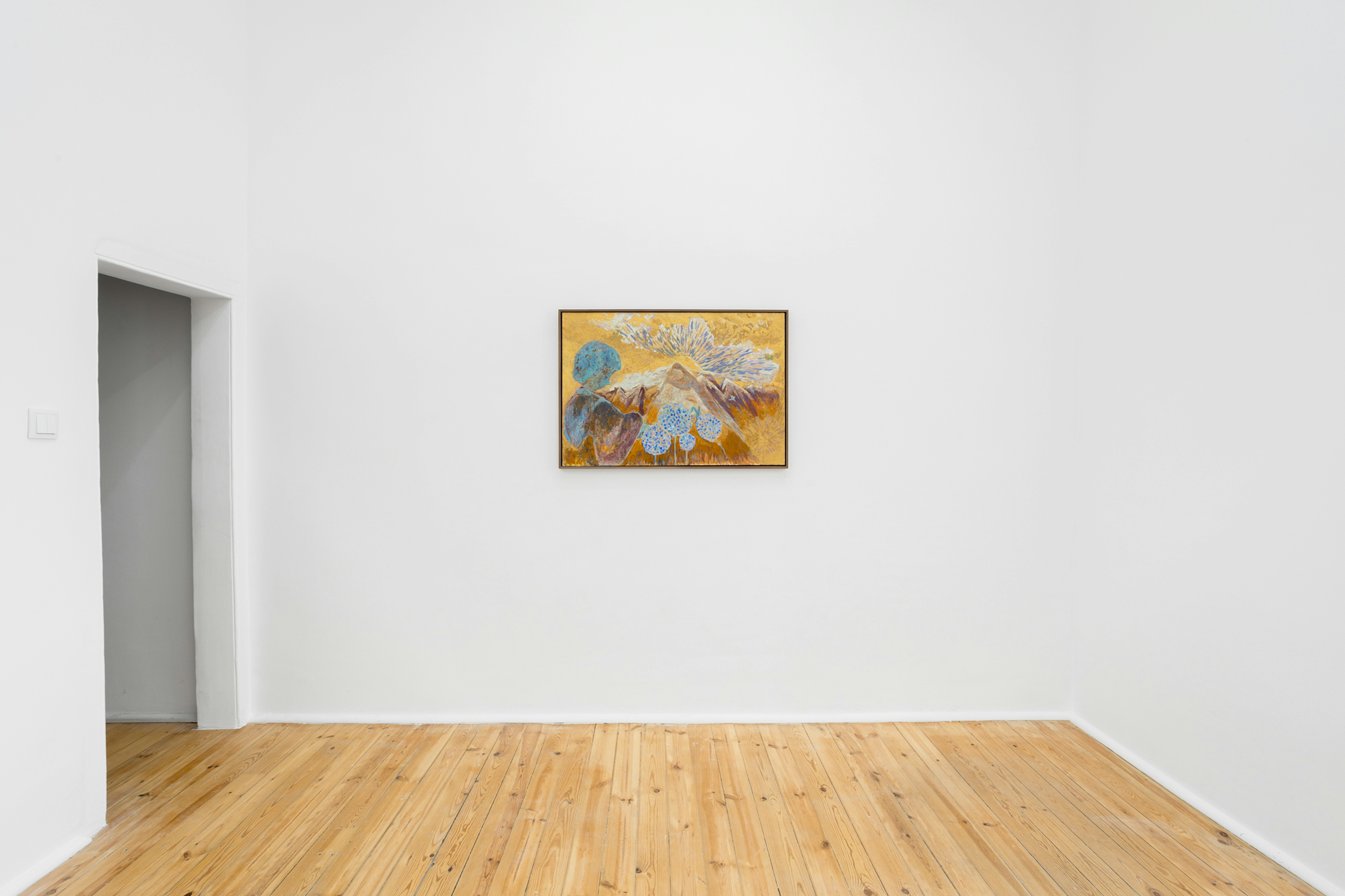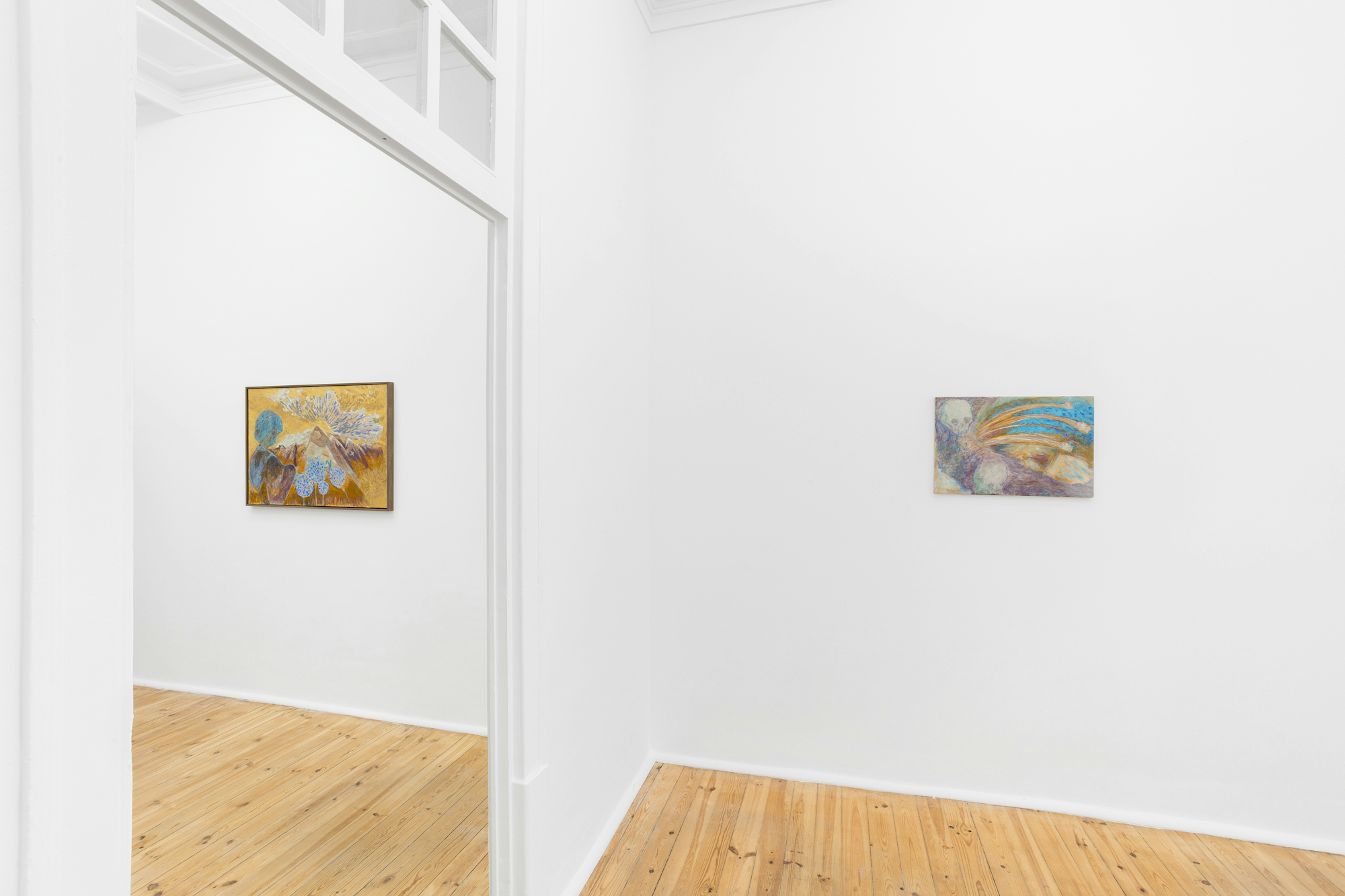 In Cradle Orchestra, a solo-exhibition by Copehangen-based artist Katrine Bobek, the colours set a vibrant tone in nine paintings, ensnaring the viewer, and warping in multitudes that appear to be as playful as they are sombre. The folkloric figures inhabit one otherworldly scene inside and after another, forming a condensed milieu that does not care for fixed categories. It is this attitude that lets compositions and an off-centred use of symbols melt seamlessly; the sun, the sky, the clouds all burst out of trembling landscapes with a blustering verve or with a serene simpleness. The inner lens used in shaping these landscapes has seasons of feelings. They fluctuate between severe and joyous sentiments, one could say only opposites by nature and thus kins through the shared gravity of their gestures.