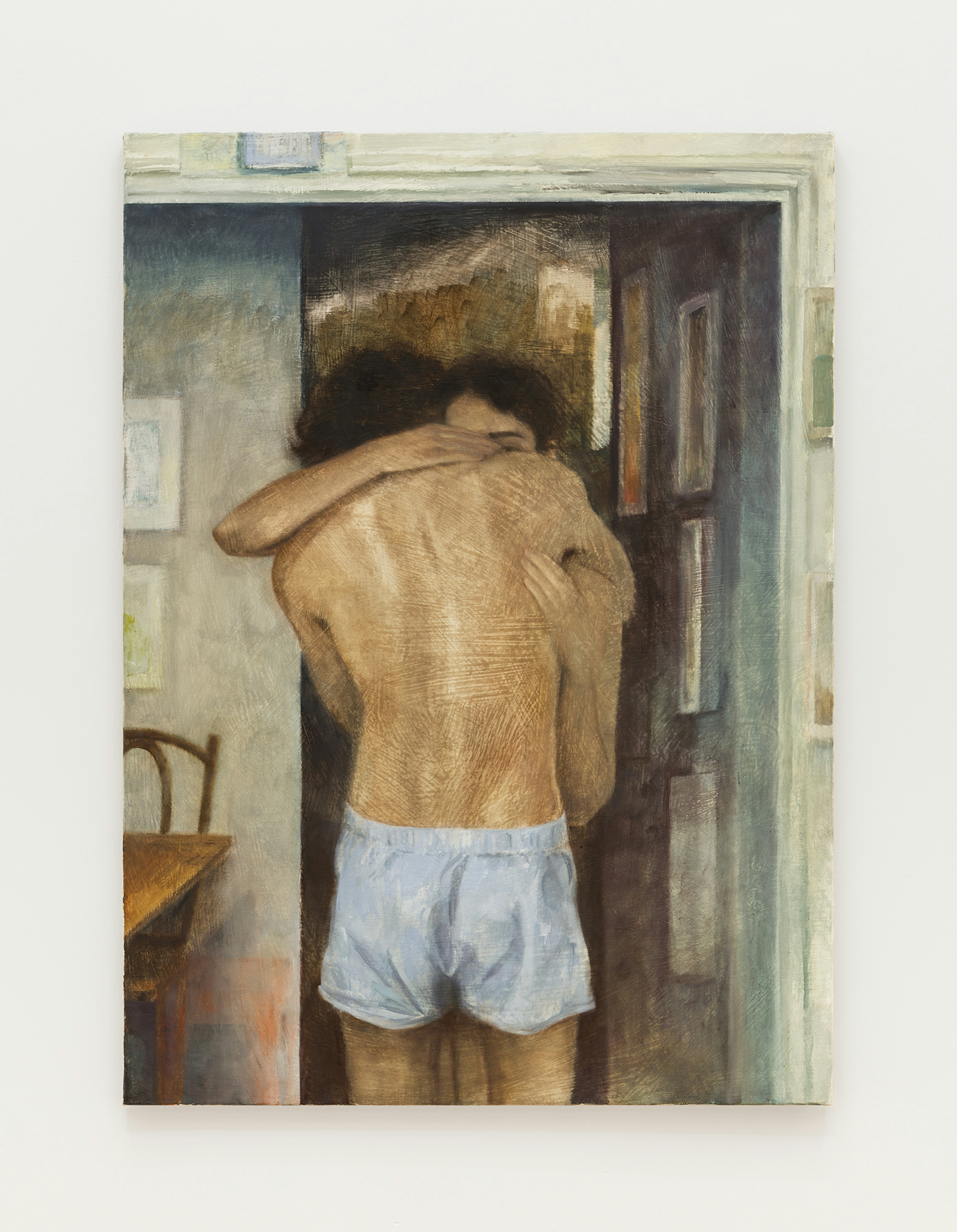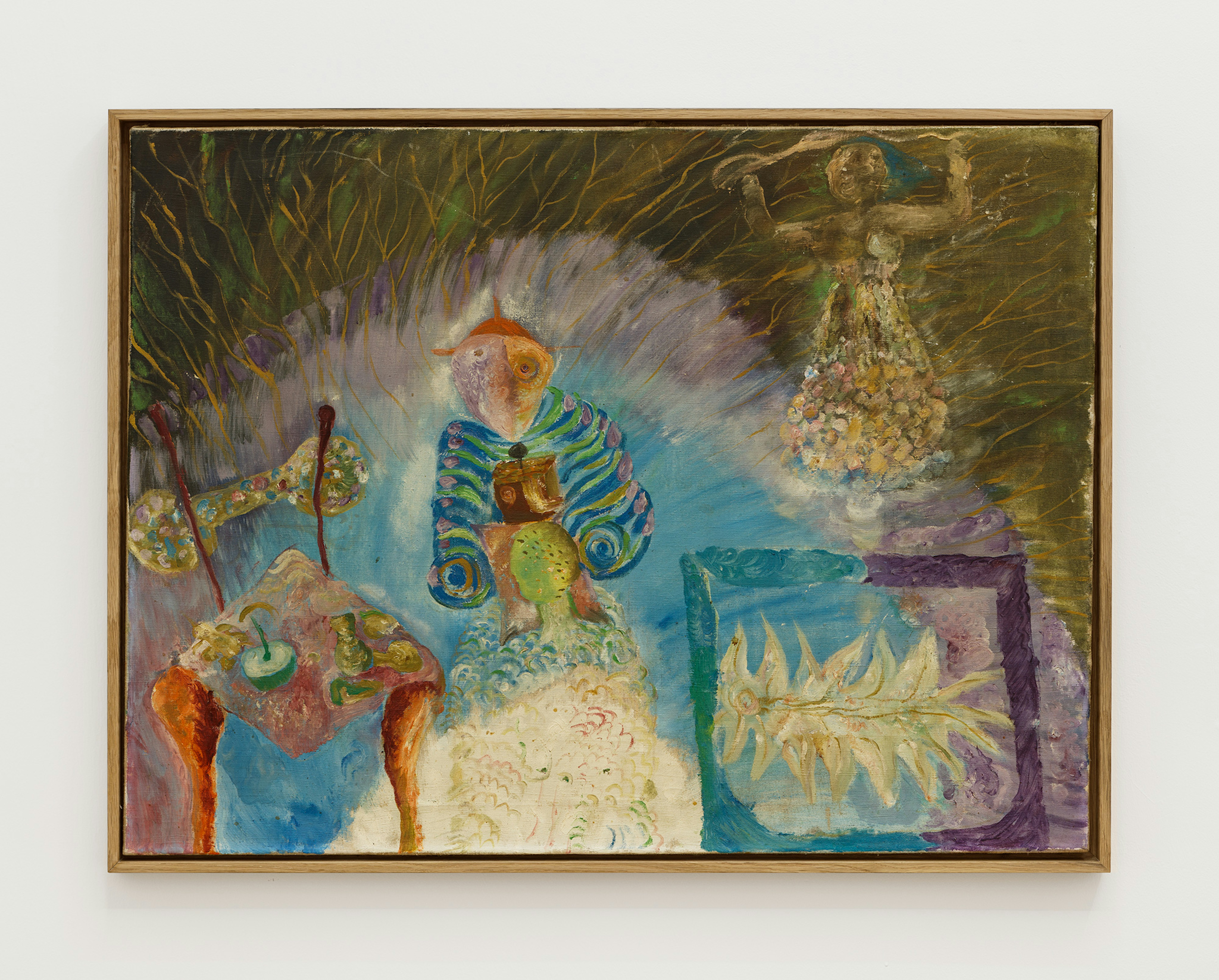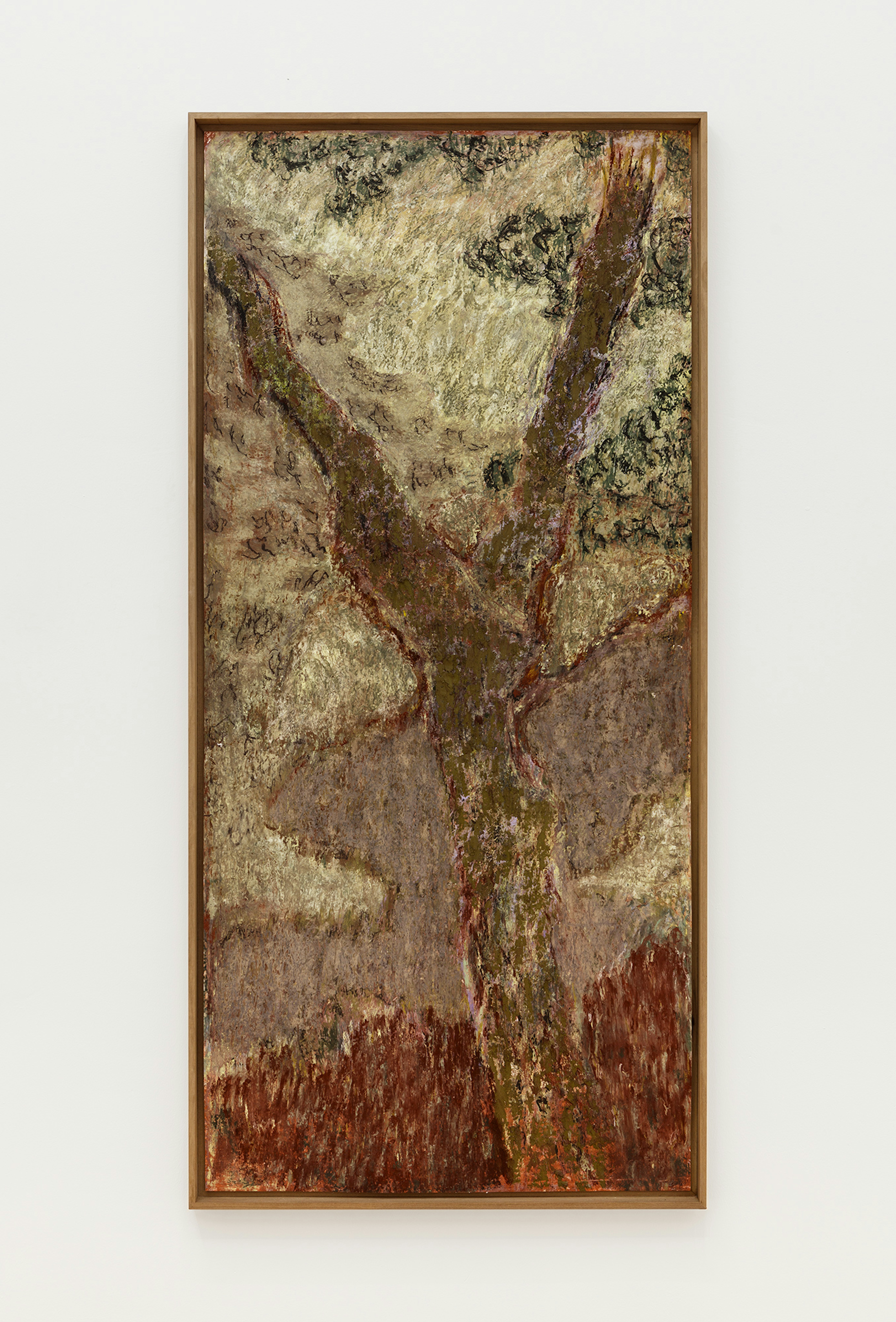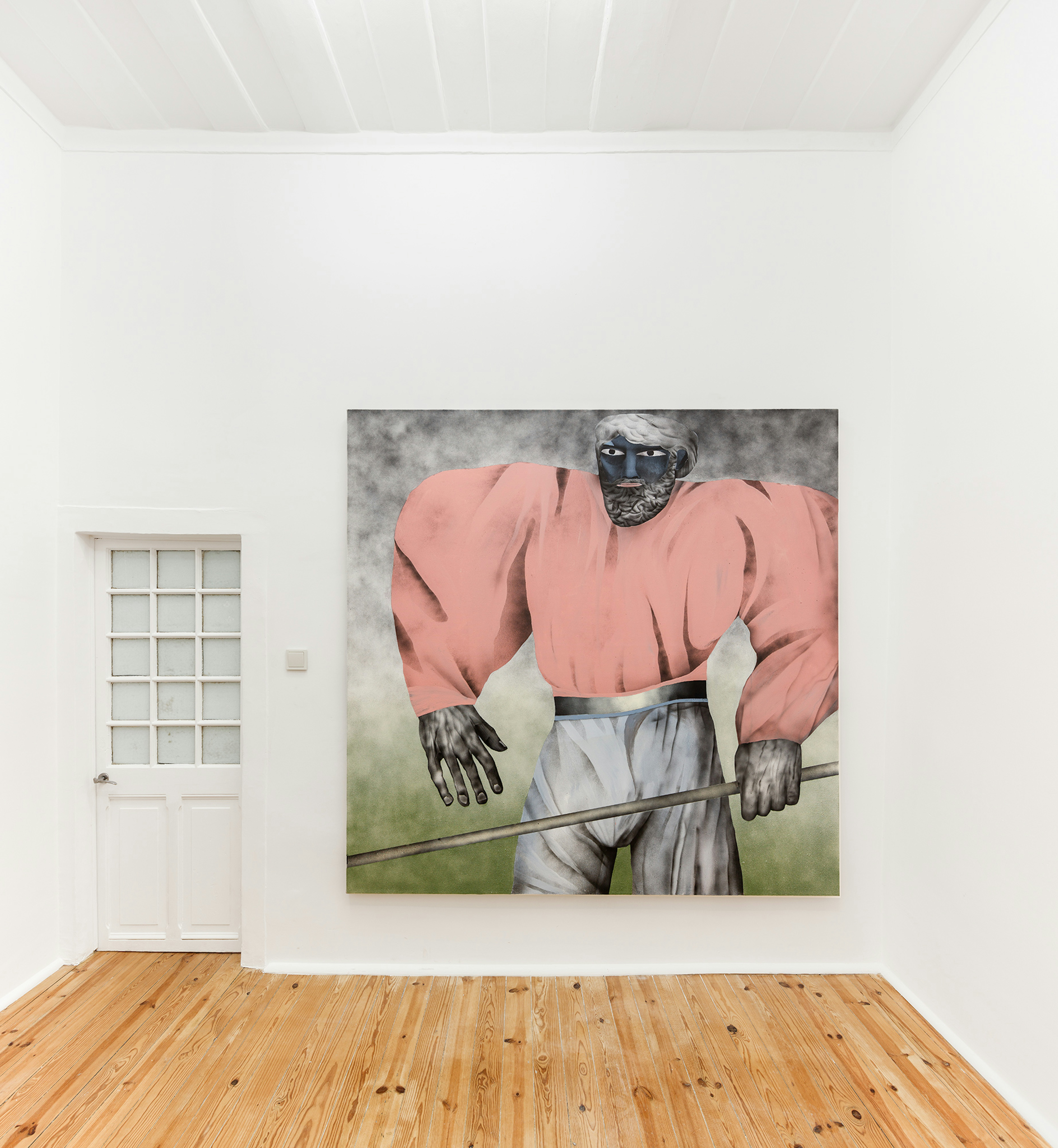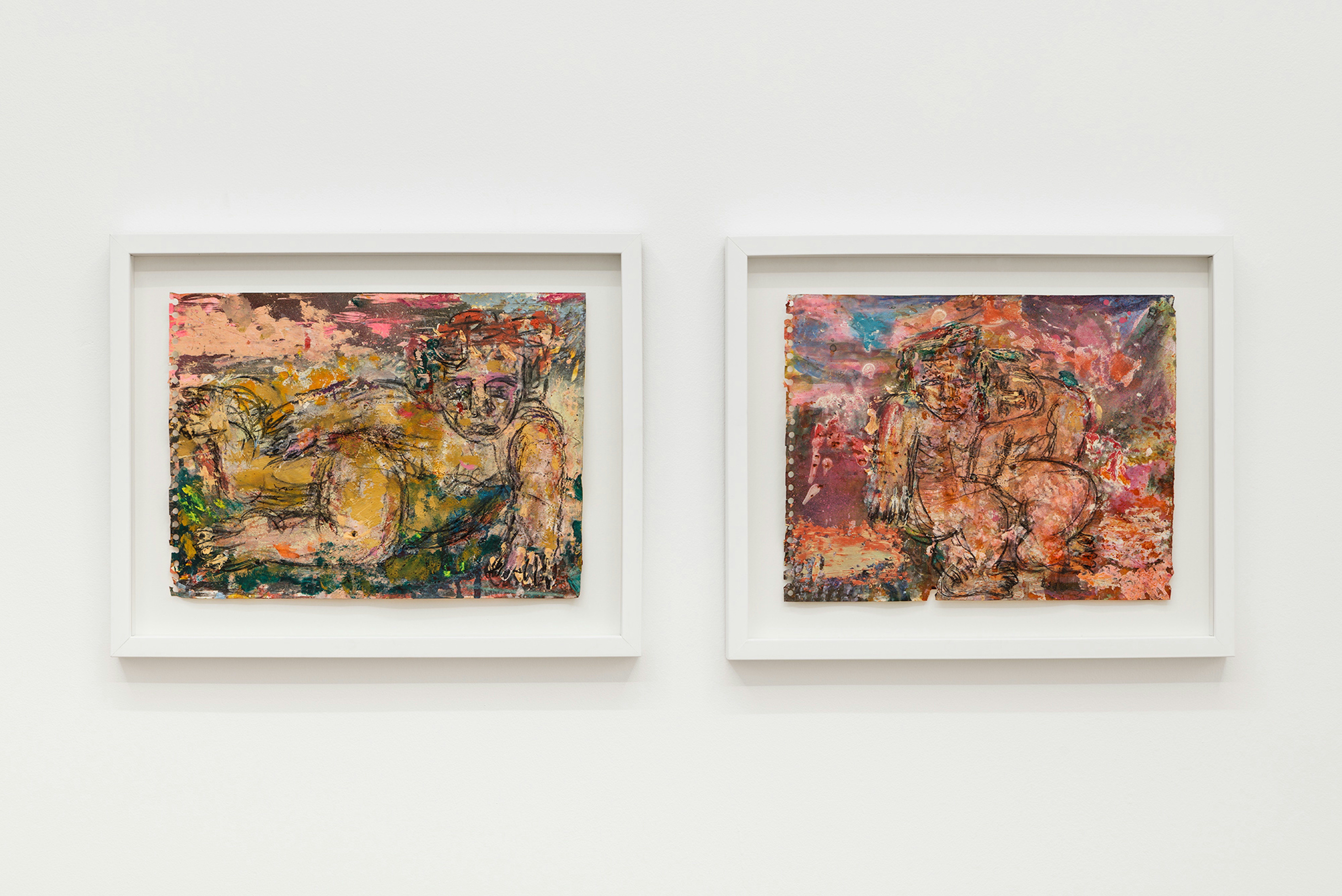 Gustave Moreau and Odilon Redon were Symbolists who explored the boundaries of representation and interrupted classic modalities, thus making way for a new frontier of artists to contemplate meaning and style. In his 1886 Symbolist Manifesto, poet and early proponent of the movement Jean Moréas asserts that the “essential principle of art is to clothe the idea in sensuous form,” a conceit that operates as a critical pivot away from the traditional mode of imitation in painting. Lines blurred and colours harboured emotive promise. The Symbolists ensured that realism was dashed by sensuousness. This is manifest in Thomas Leth’s tender depiction of a lavender river flowing through a muted landscape. A sensual tree-form occupies the foreground of this canvas. It is chiefly rendered in olive, with slivers of violet and wine punctuating its frame. Oliver Bak’s figures also offer a reprieve from exactness, their anatomies frayed at the seams by gouache and pencil markings that appear to melt into the canvase’s surface.