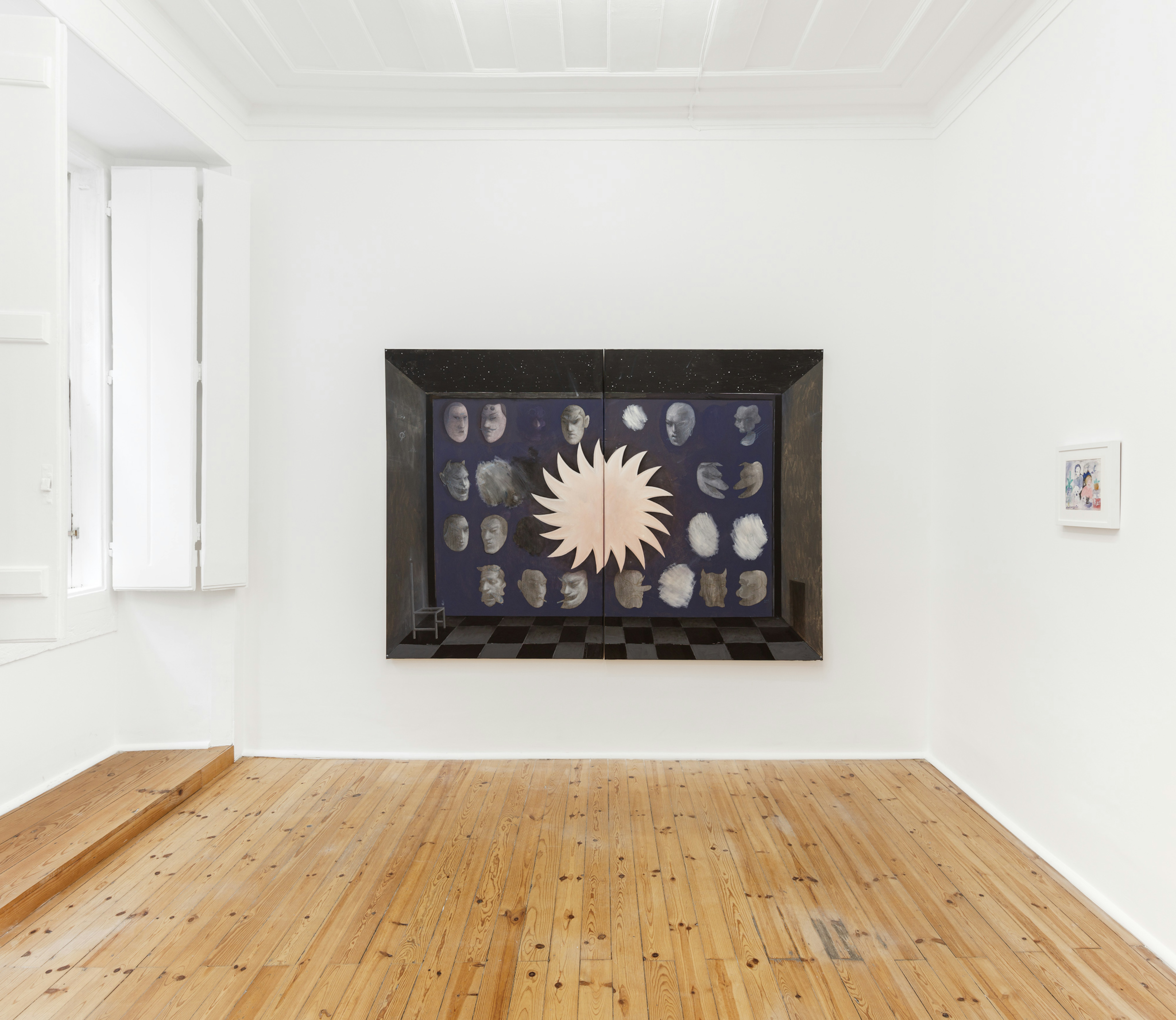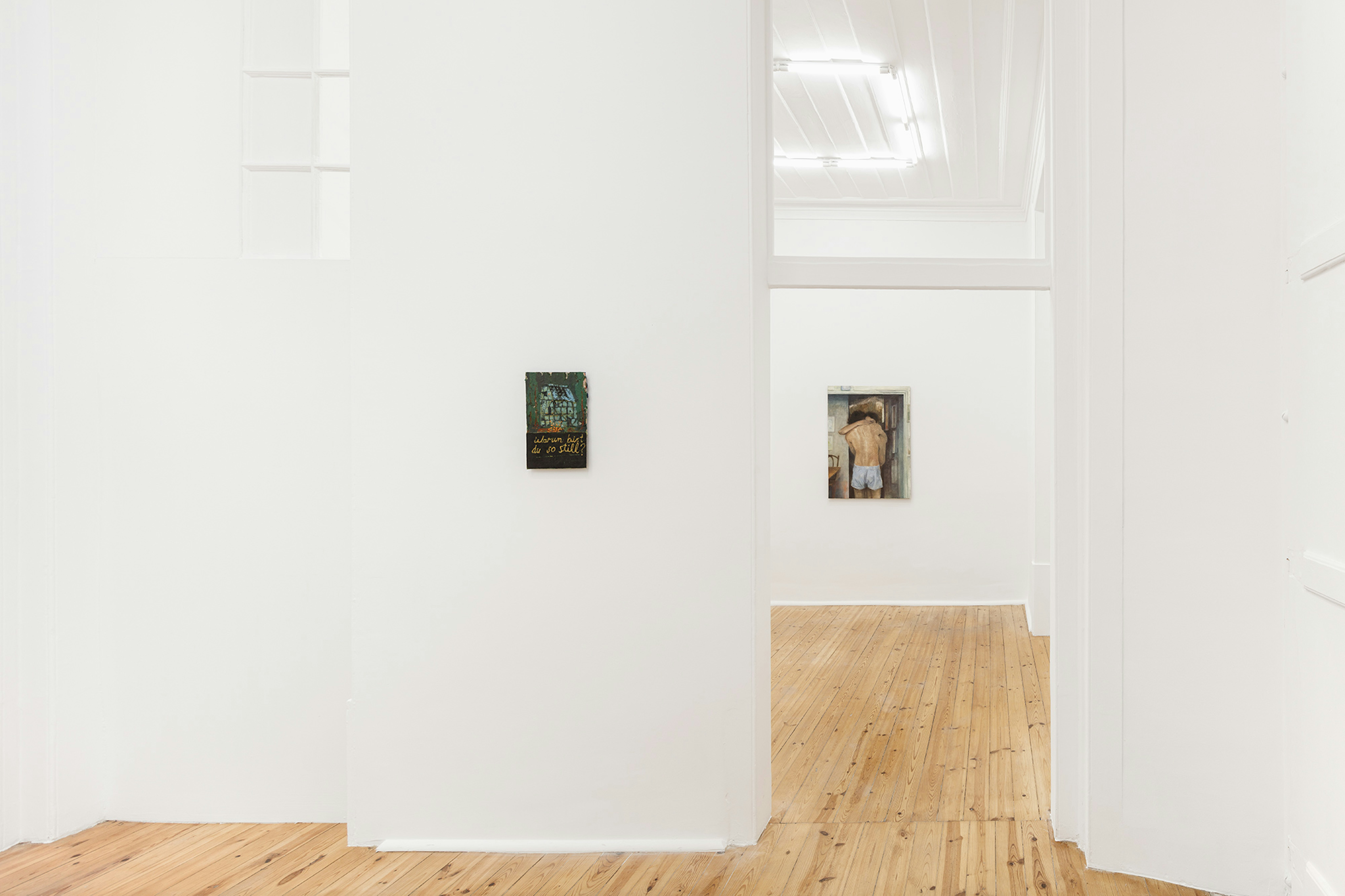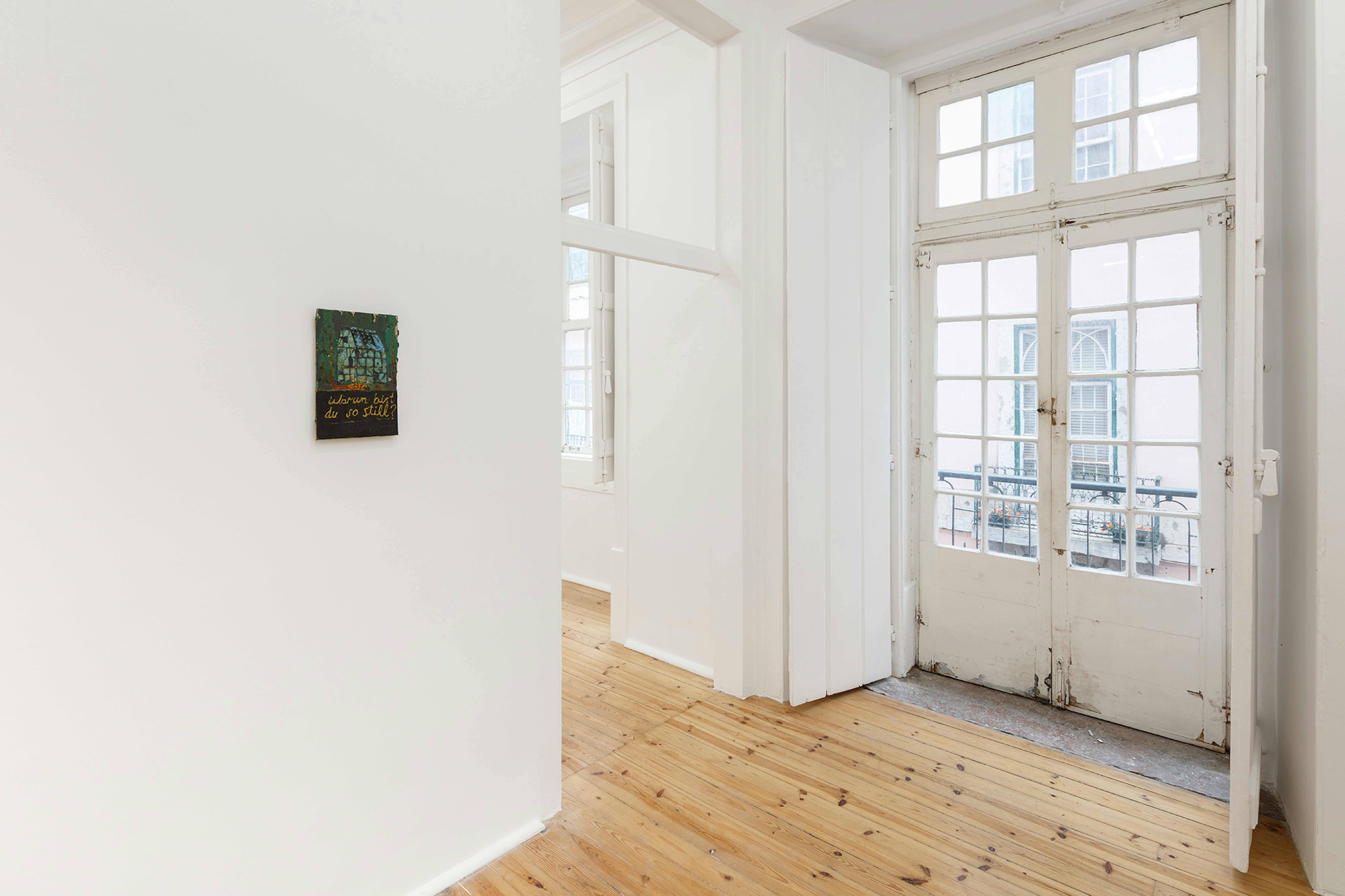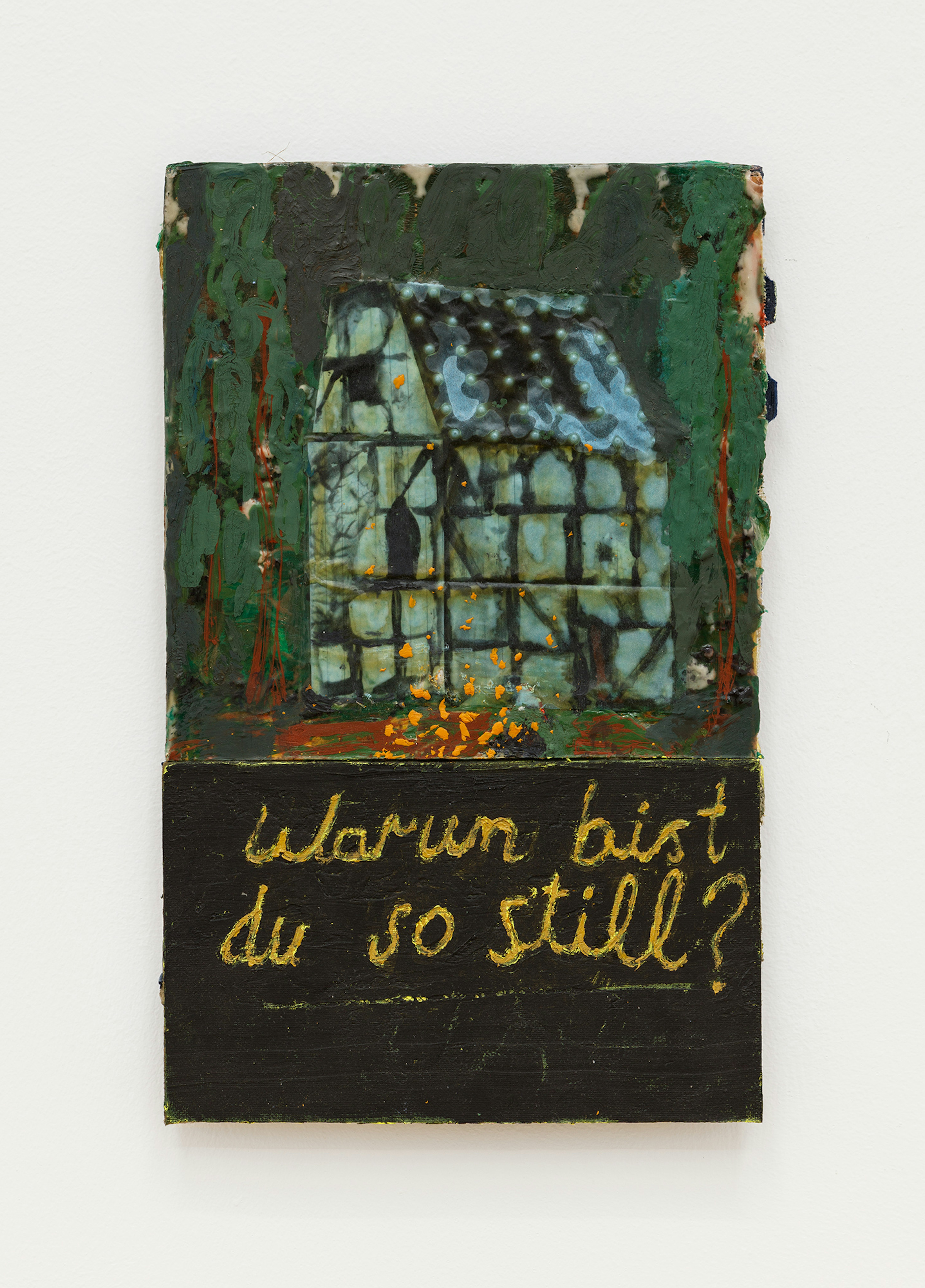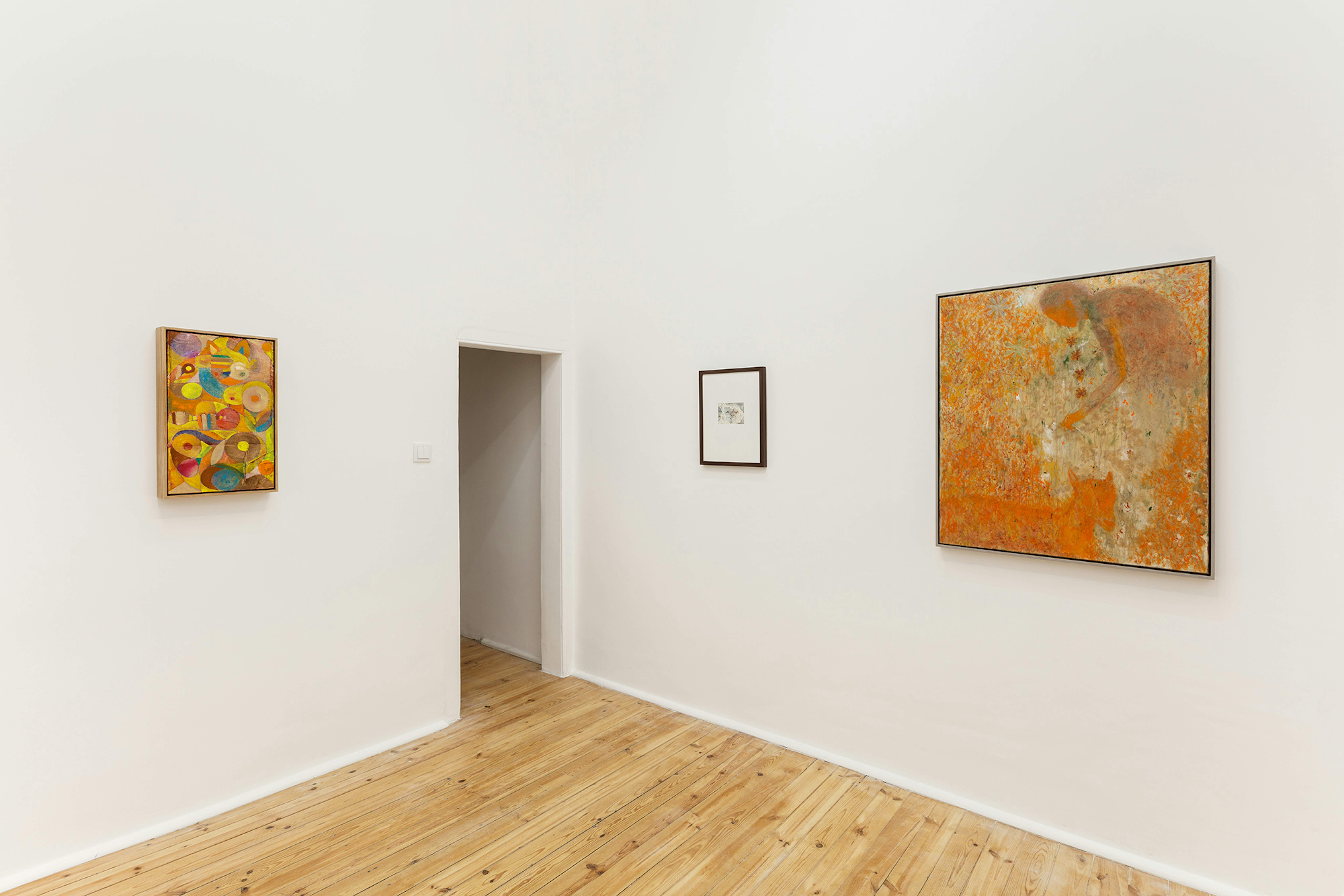 There is a certain Nabis sensibility on display. This French cohort of artists operated against the grain of impressionism and aided in the manifestation of a Symbolist epoch. Paul Sérusier, Pierre Bonnard, Edouard Vuillard and Maurice Denis were key players in the movement, each contributing their own lens to a project mired in decoration, texture, and dissolving the borders between art and design. Experimentation with surfaces ensued as these painters explored the application of materials on alternative canvases such as velvet and cardboard. Andrew Cranston’s Why are you so silent? appears in the exhibition as an ode to this modality, as a book cover offers refuge for his oils and varnish. The picture plane is split in two; A turquoise building swims in an ashen fog with evergreen trees and a petrified burst of tangerine pigment, below this scene it reads “Warum bist du so still?” in yellow cursive. Signs and symbols propagate and Denis’s The House At The Edge Of The Wood comes to mind as it too offers no real answers, only affect and a scene hidden behind a veil of smog with details obscured by the artist’s ability to render softened edges and enigmatic shapes. Elene Chantladze’s mixed media works on paper and cardboard also fall in line with the Nabis framework, as her subjects are enchanted by the history of impressionism in conjunction with Symbolist leanings. Her productions harken back to Paul Sérusier’s serene renderings of Brittany landscapes. In particular, Elderly presents the viewer with what appears to be a family portrait replete with vague plants and animals. There is a tension at play, one that precludes vivification. The pale hues and ominous features give nothing away, there are merely impressions of facts.