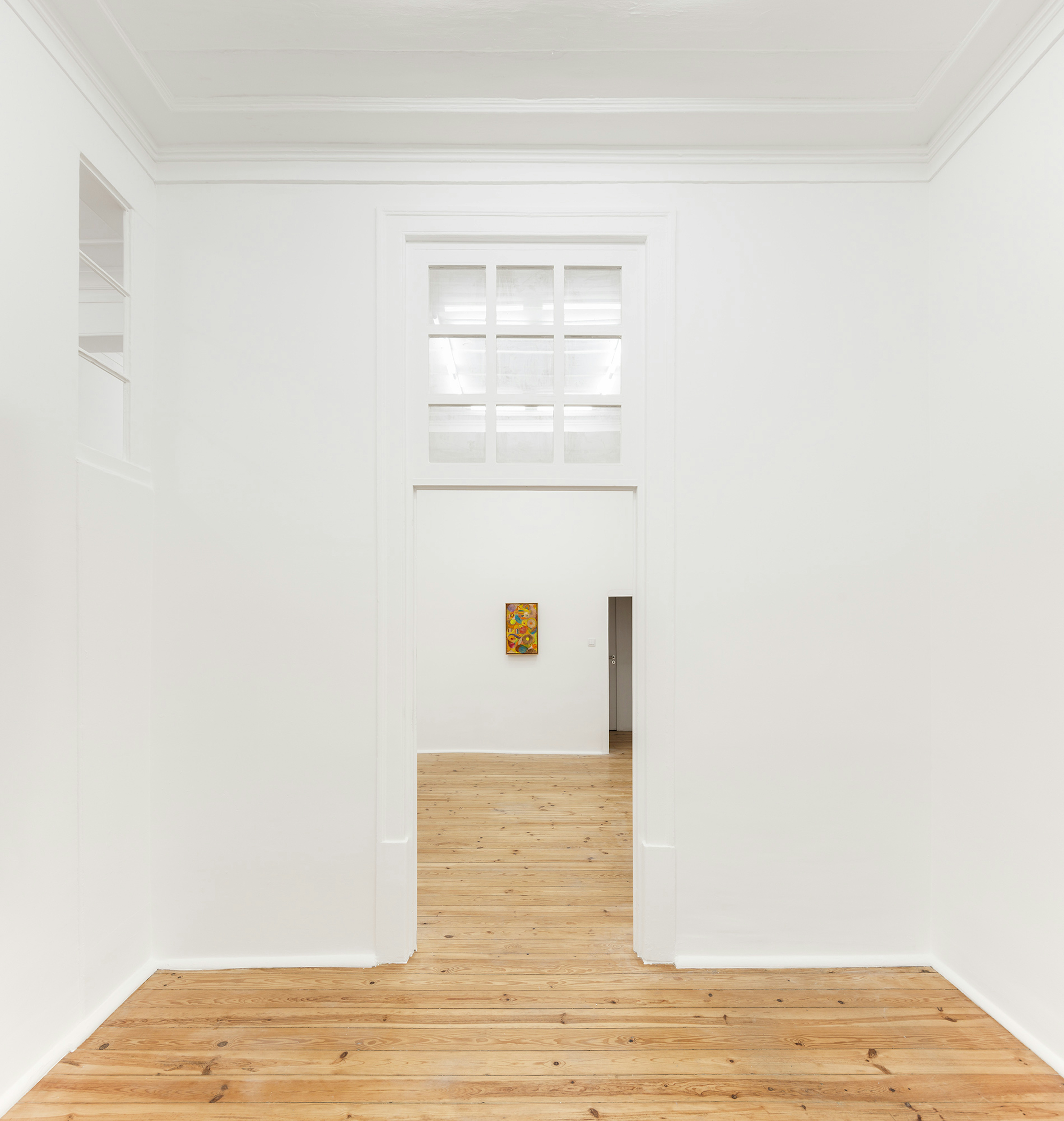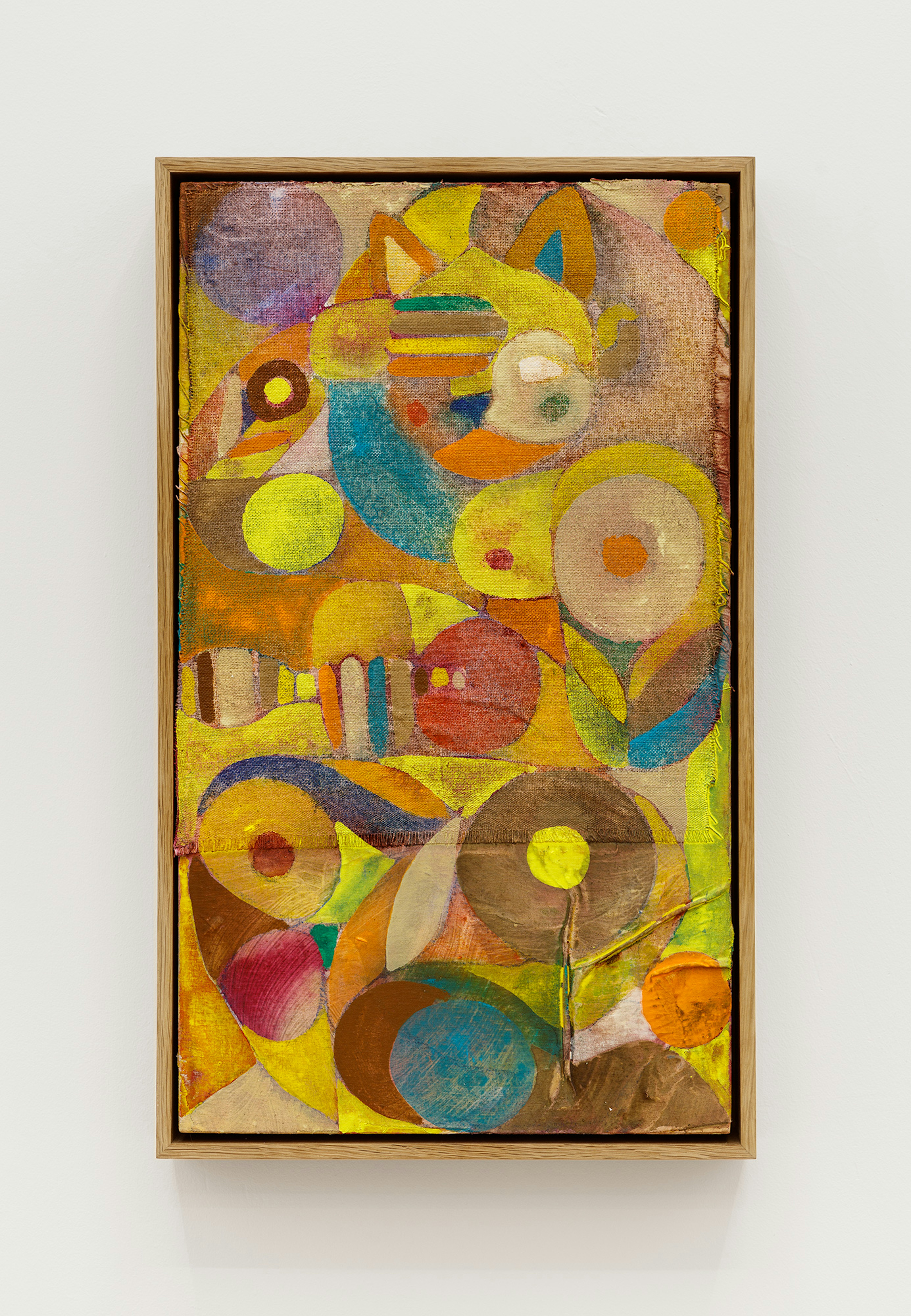 The language of Gustav Klimt is suffused in the works comprising “Fragments.” His aptitude for spectral figures and concupiscent symbolic matrices cemented his role as a vanguard of the new painting styles. He made indelible contributions to both Art Nouveau and Symbolism, with a propensity for illustration and decorative technique alongside lavish embodiments of the human psyche, he participated on both sides of the court. This ability to reflect different approaches remains a postmodern endeavour. Daniel Crews- Chubb’s canvases brush up against this lineage while offering a Baselitz-like predilection for the messied, somewhat perverse subject. Crews-Chubb’s evocation of form is in dialogue with Alexander Tovborg’s kaleidoscopic abstractions as each artist eschews a strict representationality and instead builds their subjects from distinct symbologies and archetypes. selvportræt på barsel offers swathes of acrylic and pastel that fold into each other, producing a networked system of luminous shapes. Still, Tovborg’s thick yellow surfaces mirror Klimt’s gold leafed canvases and a predilection for geometries further supports a connection between the two artists’ approaches.