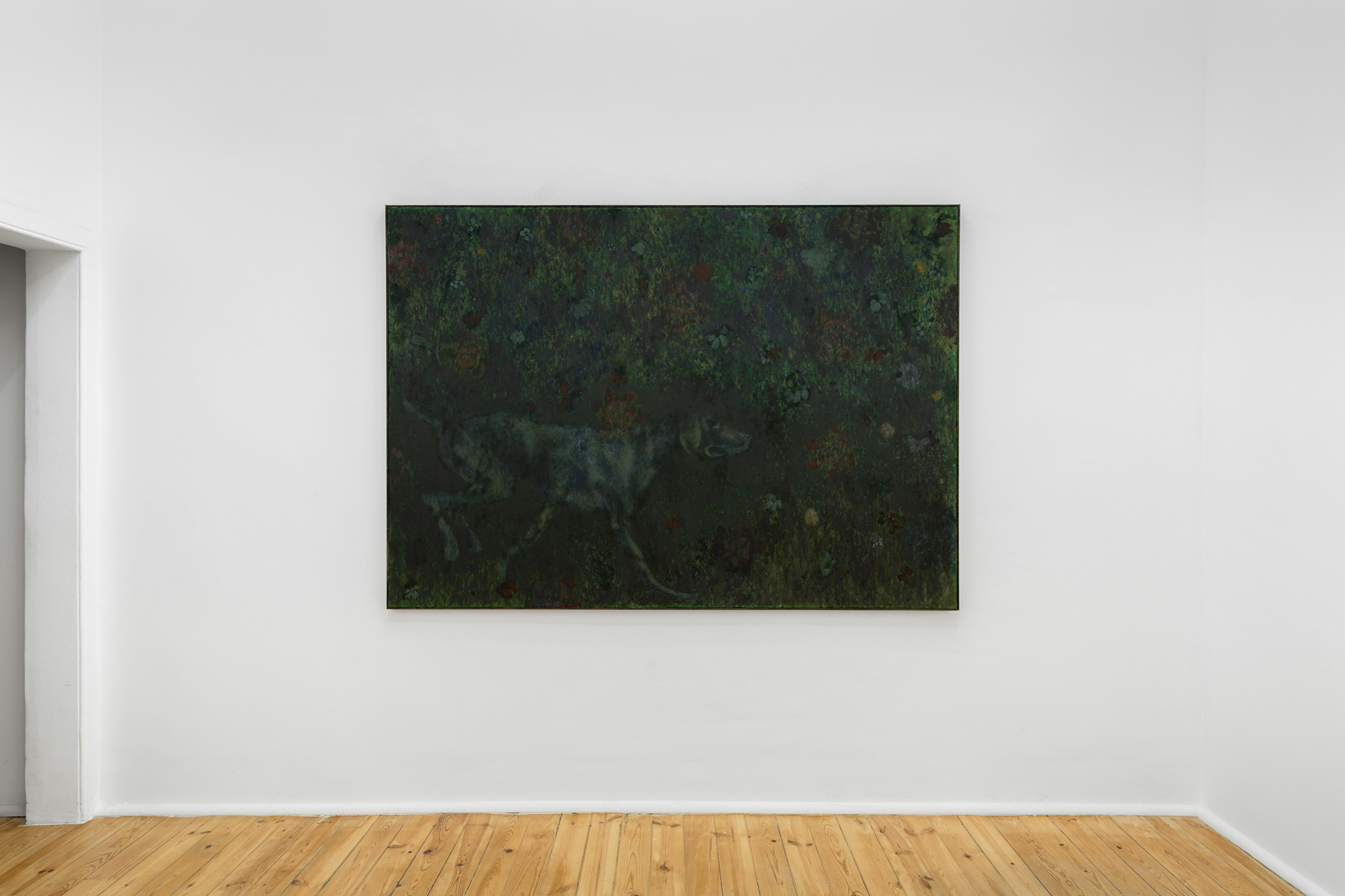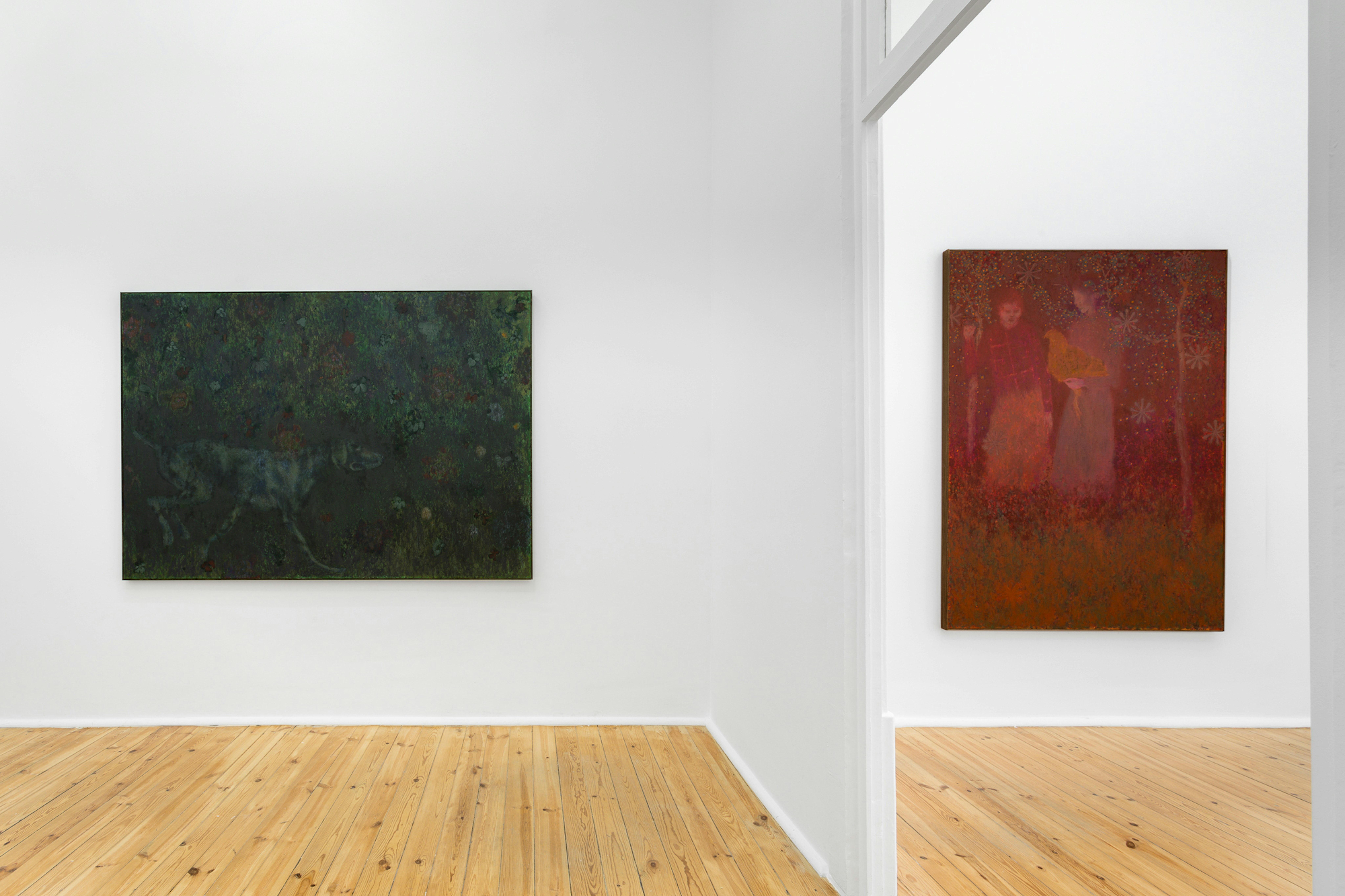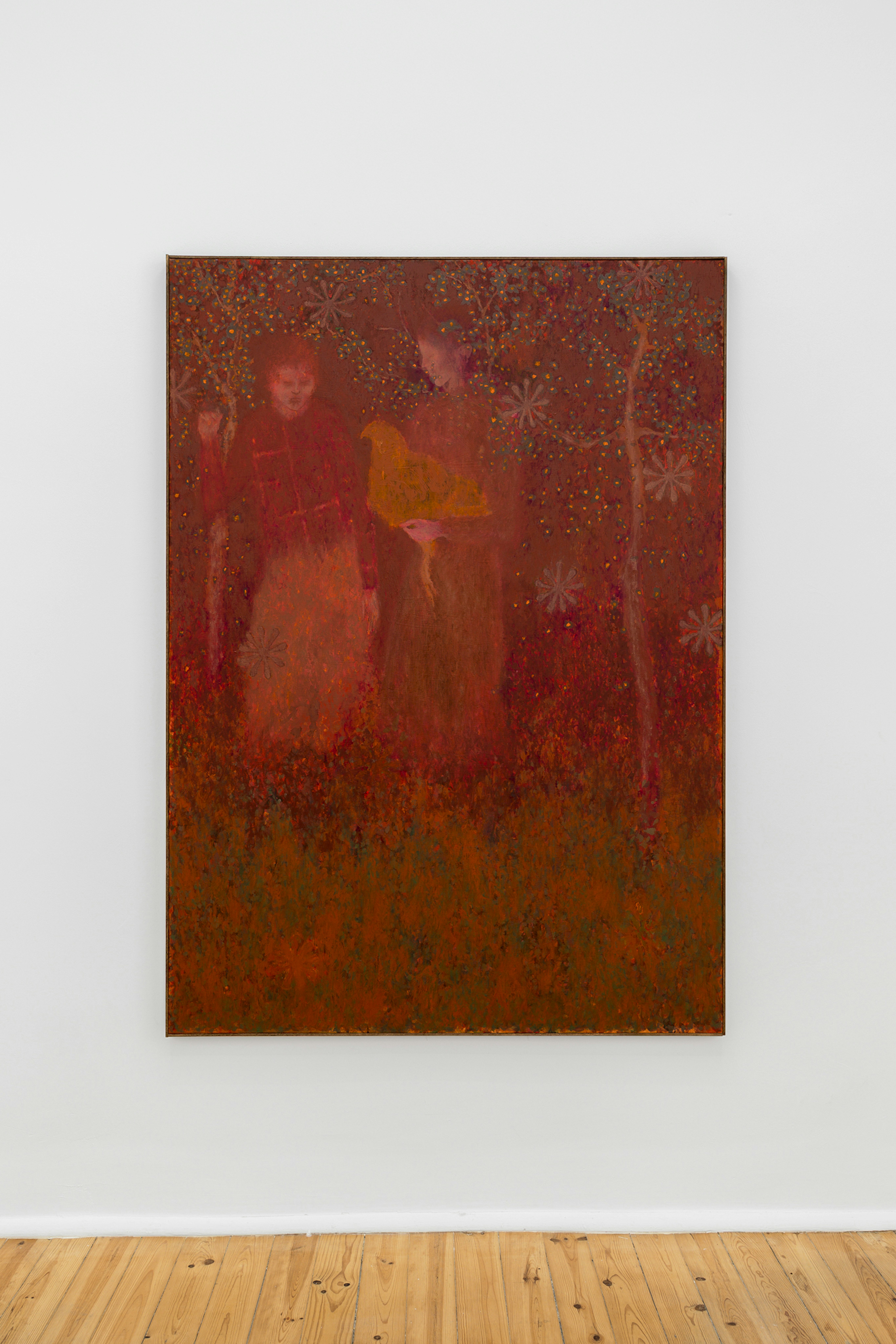 Often drawing on art historical references, Bak’s paintings contain a temporal complexity establishing the possibility of a new horizon between the past and today. Substantial chromatic backgrounds transforming into vague landscapes inhabited by human figures, animals and natural objects. The interplay between his beings and their environments are deliberately blurred, weaved together by a glow or its opposite, as if to point at the social and psychological contractions of the characters as symbolic gestures. The material processes and layers are pulling the imagery farther away from the source material and into its own reality, where narratives unfold untroubled by a lyricism of the past. Bak’s motifs suggest a take on the romantic, but one that is muted by internalised emotion and expression - a calm dramatics, searching for a point where the figures are equally emerging from and camouflaged by their surroundings, protected and empowered, muted but screaming.