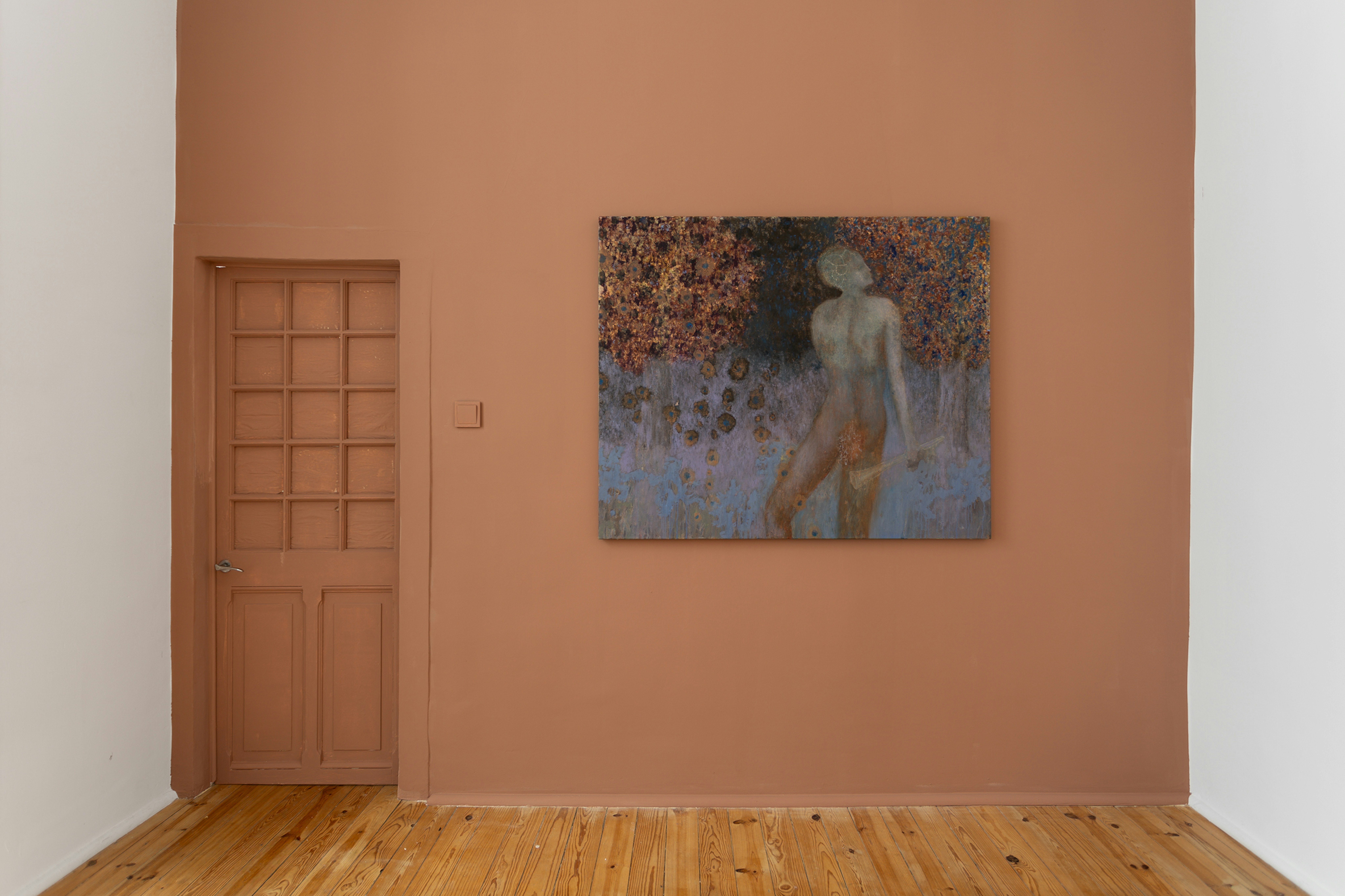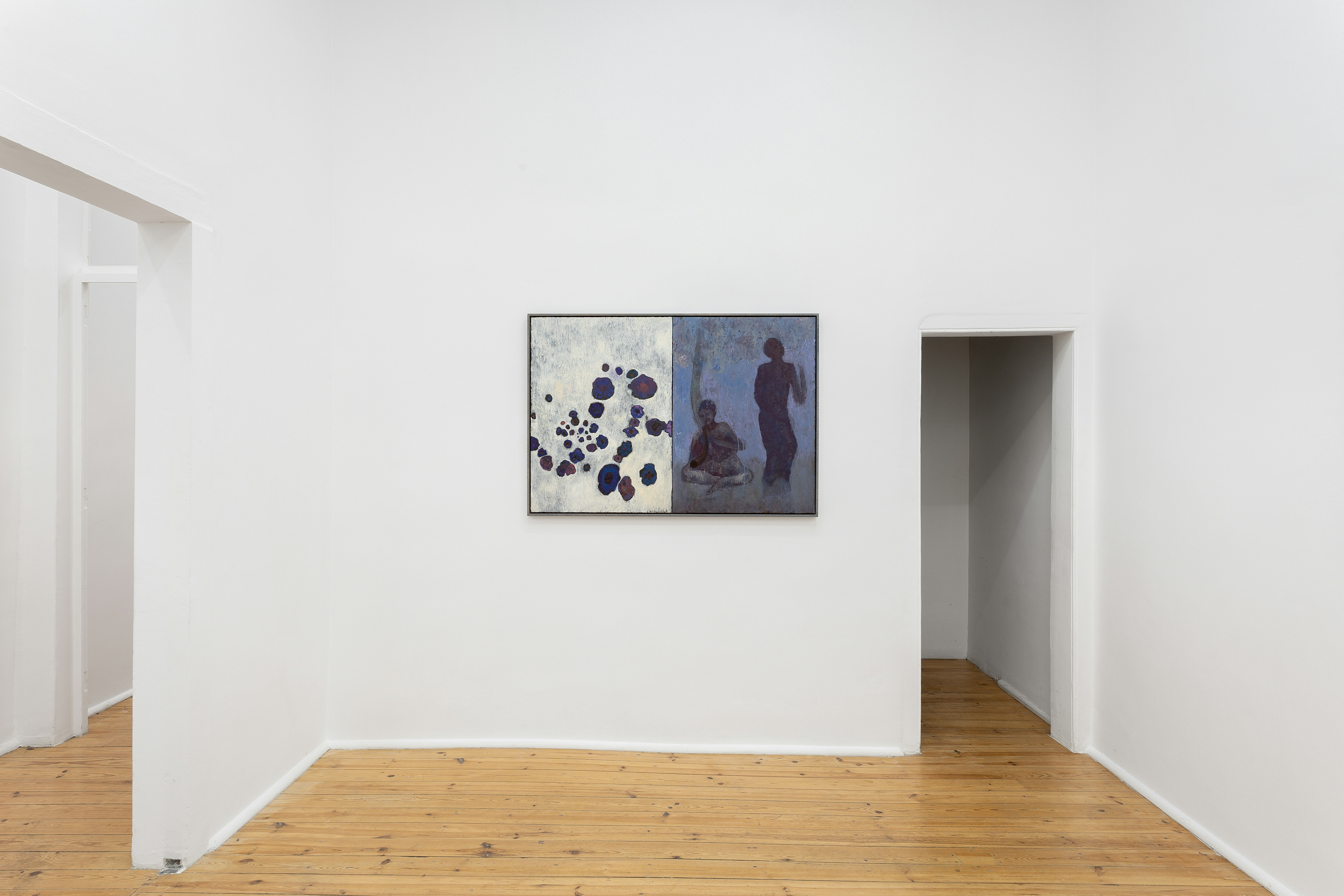 In other works, such as Playing Ghost, and Satyr (Alteration of Titian), music emerges as a central organising principle. Both of the figures clutch pipes, the former private and forlorn, cast in feathery purple hues, the latter intrepid, facing a beckoning clearing in the trees. In both works, falling flora seem to give shape to imagined music ringing mutely from the canvas, implying the figures’ ability to shape their surroundings to their needs. Here, it seems less that the satyrs are moving through the landscape, and more that the foliage bends to their whims.