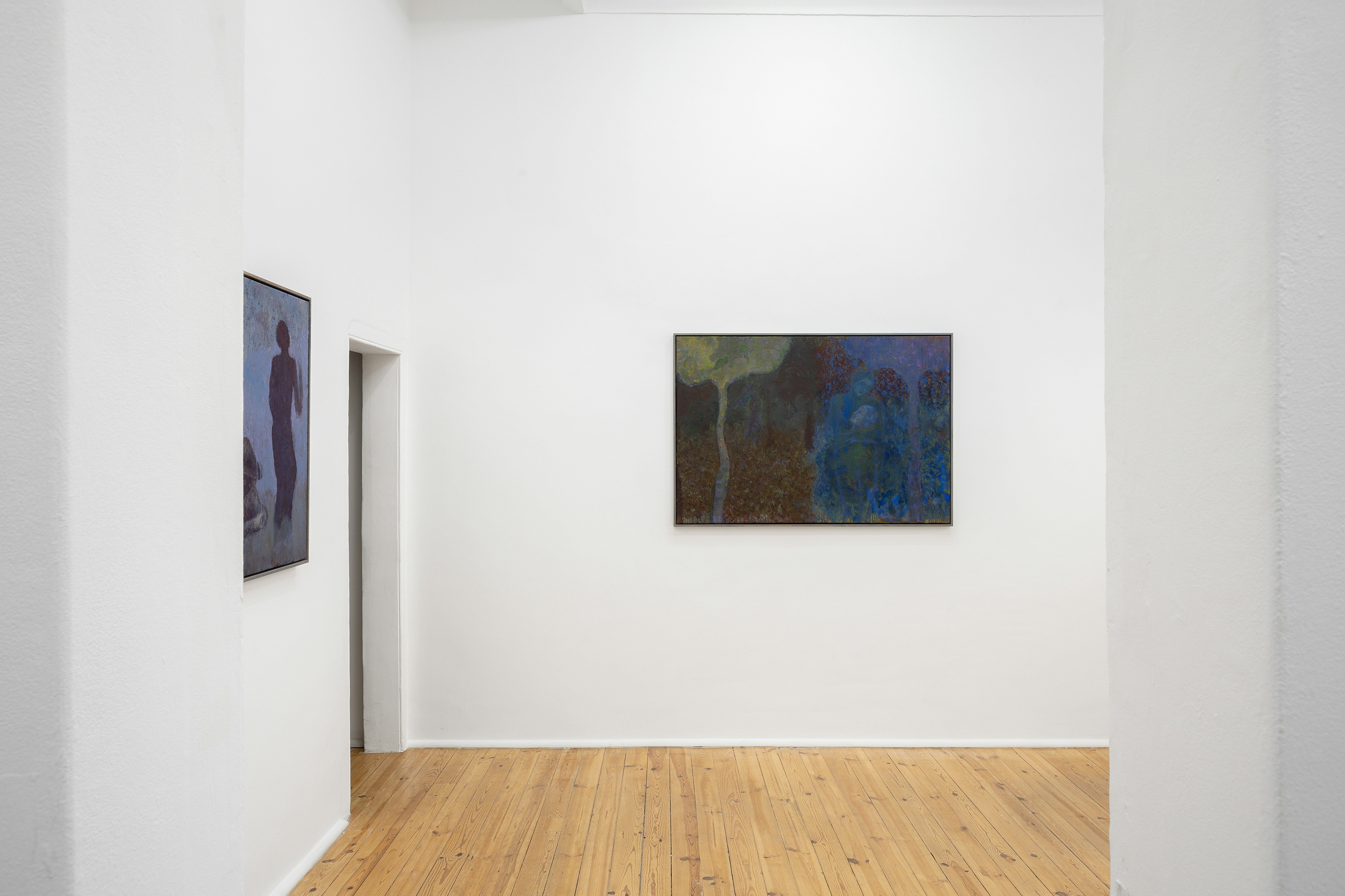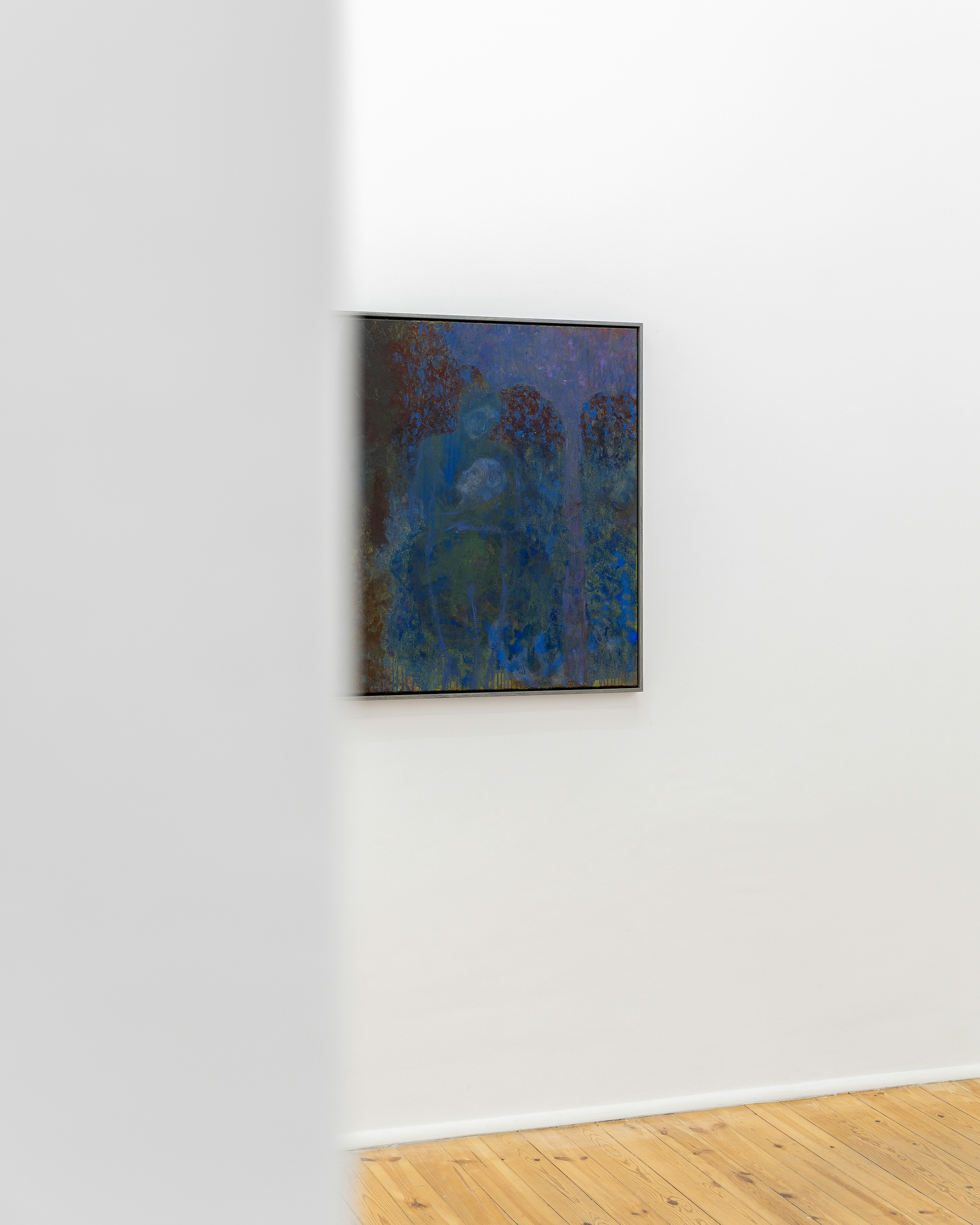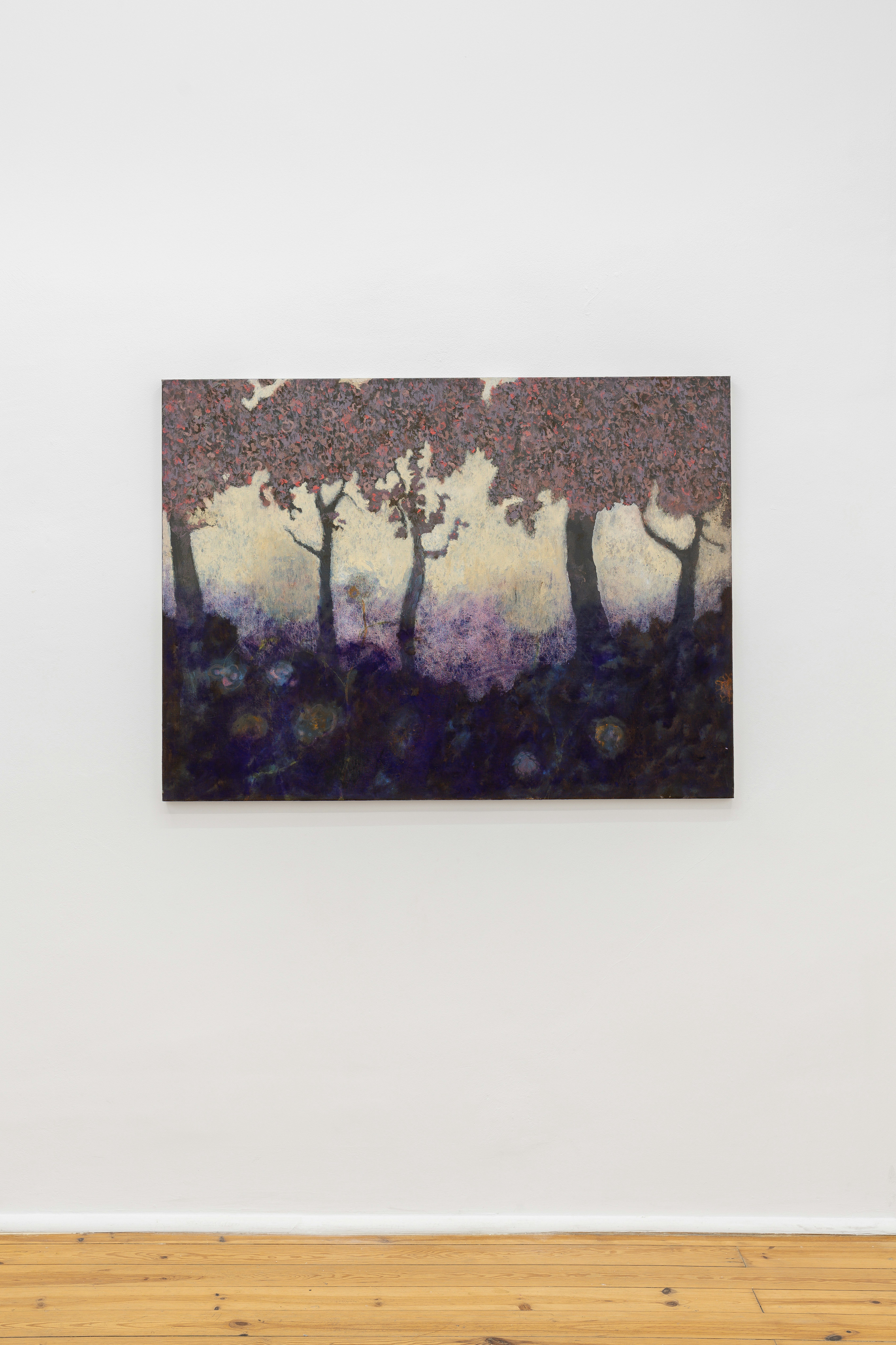 In Romance and Horror, the silhouettes of two figures are loosely demarcated: one tall and dark, arms curled demonstratively above their head, the other supine, odalisque, and almost transparent, blending in with the foliage. Encircled by twisted trunks and an ever-present curtain of falling blossom, the figures take on a symbolic dualism, their feet lightly touching in a suggestion of interchangeability. Their inscrutability lends imaginative intrigue, intimating unknown and possibly malevolent intentions. Similarly, in By the River, three satyrs emerge from the shadows, barely indistinguishable from stygian forestry. Two embrace in a gesture of ennui; one prowls, delphic, playing a pipe in the distance. Structured symbiotically, Bak’s palette encases each in a halo of rich umbers and sombre blues. Their separation takes on a symbolic weight, suggesting a permeable veil between worlds, in which the satyrs roam freely.