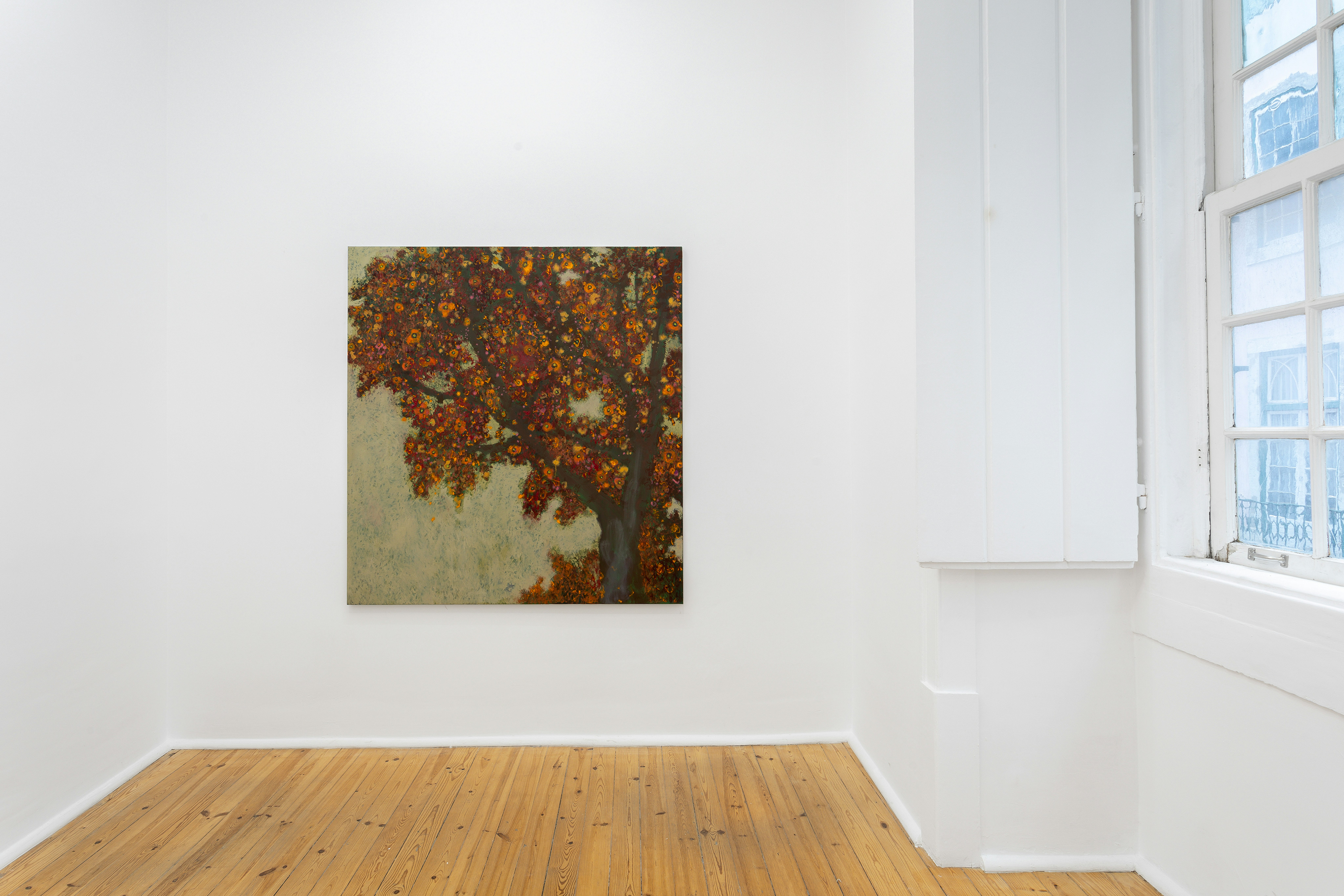 Within the exhibition, the presence of mythological satyrs and their relationship to their utopian surroundings conceptually dictates the form of the works. Within bucolic scenes, spectral satyrs drift in and out of perception in verdant, canopied, and luminous landscapes. Posturing, reclining, revelling, or hiding in dense flora, there is an idle playfulness to them, but also an implication of a nymph-like changeability: their dual capacity for joyousness and cruelty.